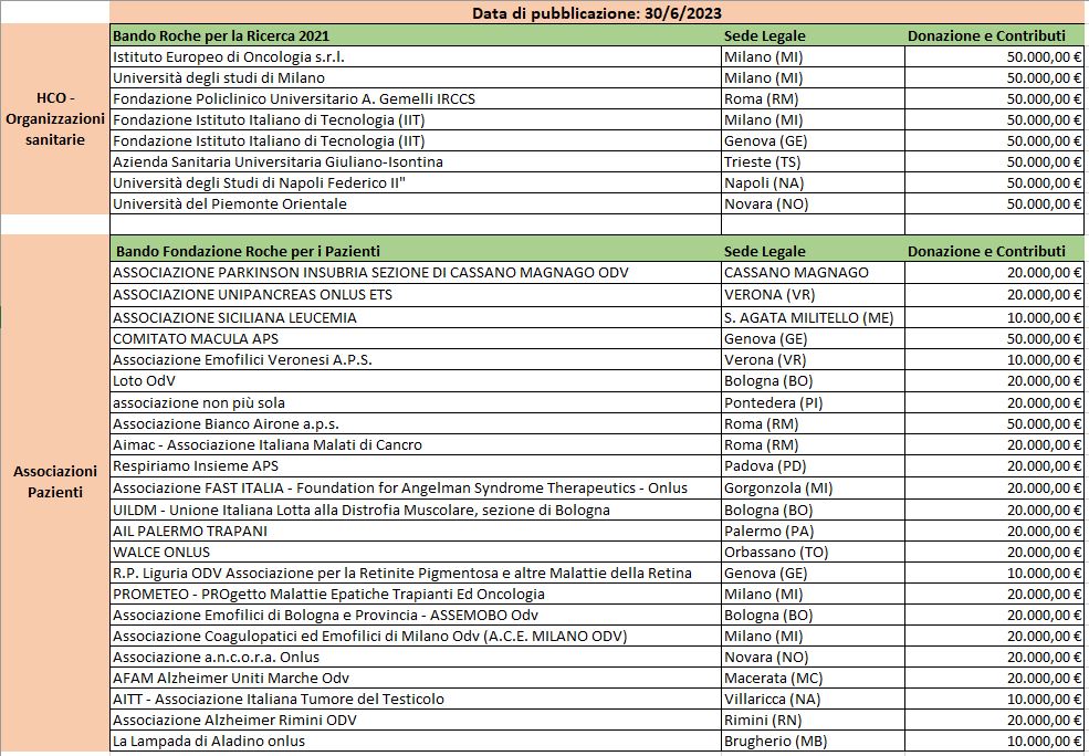 In ogni caso, in una prospettiva di massima trasparenza, nella tabella seguente, redatta secondo le indicazioni di Farmindustria, sono riportati i trasferimenti di valore erogati nel corso del 2022 dalla Fondazione Roche. Si tratta nello specifico del supporto agli enti vincitori del bando “Roche per la Ricerca 2021”, che sostiene la ricerca scientifica, selezionando tramite una commissione terza specifici progetti promossi da enti pubblici o privati operanti nel settore scientifico/sanitario.