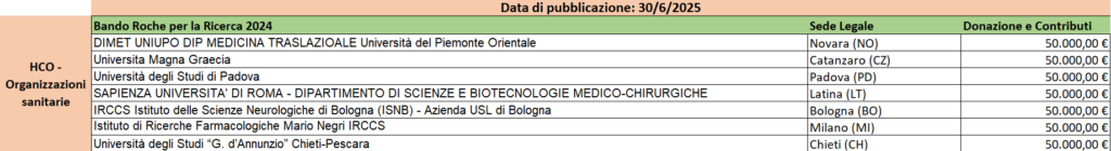 In ogni caso, in una prospettiva di massima trasparenza, nella tabella seguente, redatta secondo le indicazioni di Farmindustria, sono riportati i trasferimenti di valore erogati nel corso del 2024 dalla Fondazione Roche. Si tratta nello specifico del supporto agli enti vincitori del bando “Roche per la Ricerca 2024”, che sostiene la ricerca scientifica, selezionando tramite una commissione terza specifici progetti promossi da enti pubblici o privati operanti nel settore scientifico/sanitario.